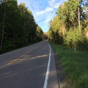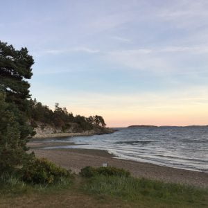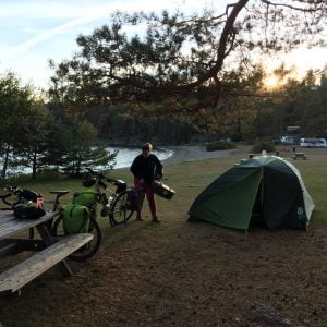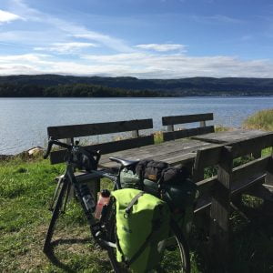 We spend the offline afternoon sitting and relaxing – me writing postcards and Sissel reading her book. Quite idyllic, apart from the pesky sun finding its way into us, and an even more pesky squirrel who’s trying to get into the food pannier and the bin bag. Foolishly I’ve left the food pannier away from the table, in the shade, so I discover the squirrel’s been having a right go at it, gnawing away at the strap.